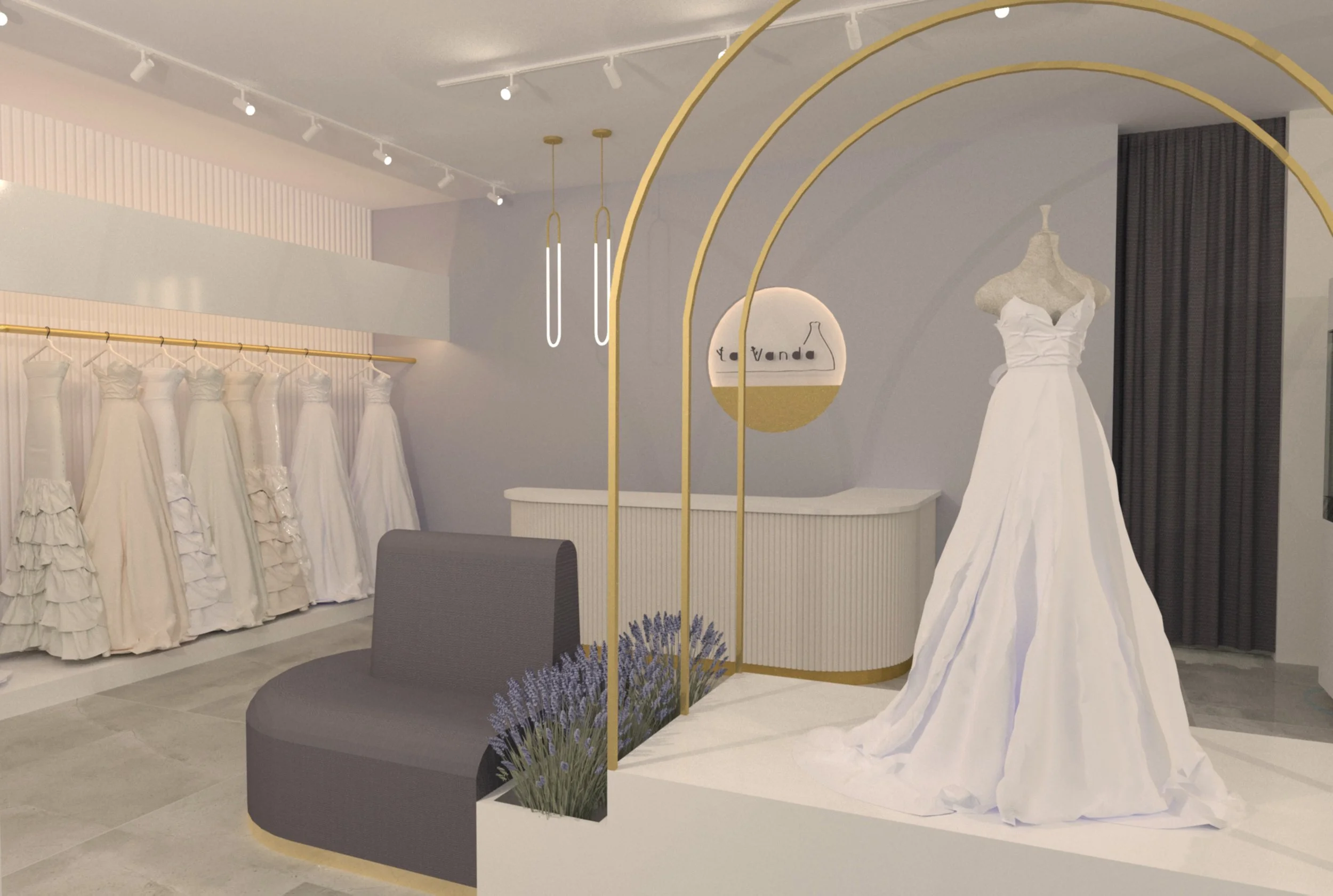 Inspired by Roman arches, the intent is to create a grand and relaxing space for brides to confidently pick THE dress and the rest of their big day’s necessities. The arches are used to highlight each mannequin with its dress as a focal point that attracts visitors’ attention as soon as they enter the store. The combination of warm calm colors, curved forms, and soft textures plays a vital role in manifesting a feminine environment that shapes a holistic journey for each bride-to-be.